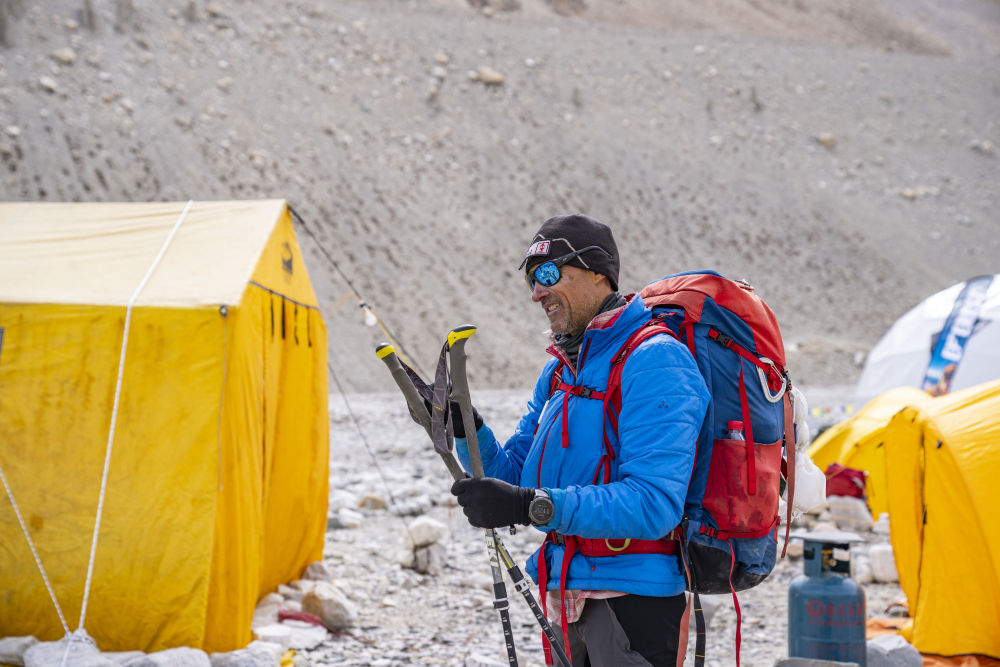 在珠峰登山大本營,弟弟帕斯卡爾·德諾埃爾正在整理自己的登山杖(5月18日攝)。新華社記者 孫非 攝
