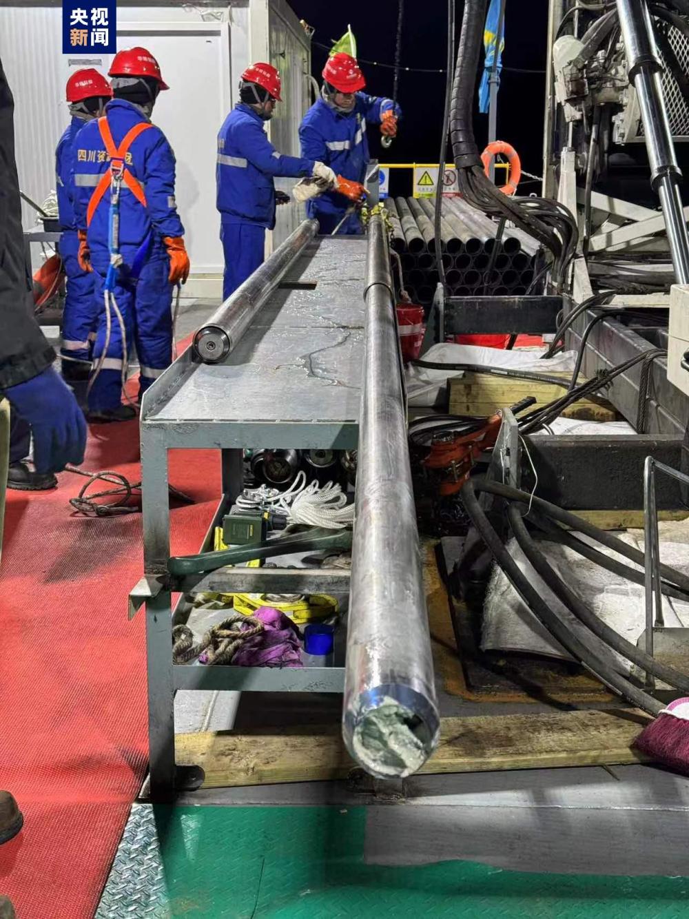 6月6日作為鉆芯的第一天,經(jīng)過不斷地調(diào)整和試驗(yàn),當(dāng)晚23時(shí)20分,第一次正式鉆探開始,鉆頭深入到了水下95米左右的位置,在第一個(gè)點(diǎn)位開始鉆取湖泊巖芯。23時(shí)40分,科考團(tuán)隊(duì)獲得了第一批湖泊巖心樣本。科研團(tuán)隊(duì)每次鉆取3米一段,通過24小時(shí)輪班不間斷作業(yè),截至7日早6時(shí),已獲得9米長(zhǎng)的巖芯。