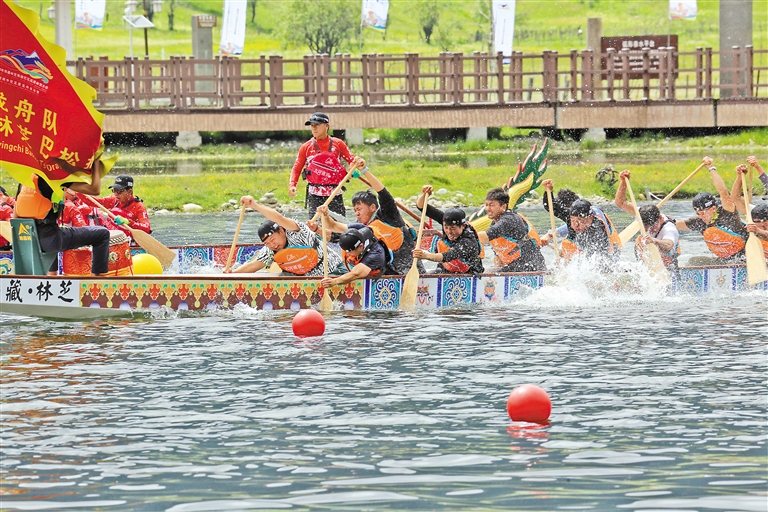 6月10日,2024年西藏林芝南迦巴瓦高原體育大會魯朗中尼高原龍舟友誼賽精彩上演。來自尼泊爾、新加坡和北京市、云南省以及拉薩市、林芝市等多地的8支龍舟隊,百余名運動員奮力揮槳、激流勇進,為廣大群眾和游客獻上了一場水上競技的“大餐”。