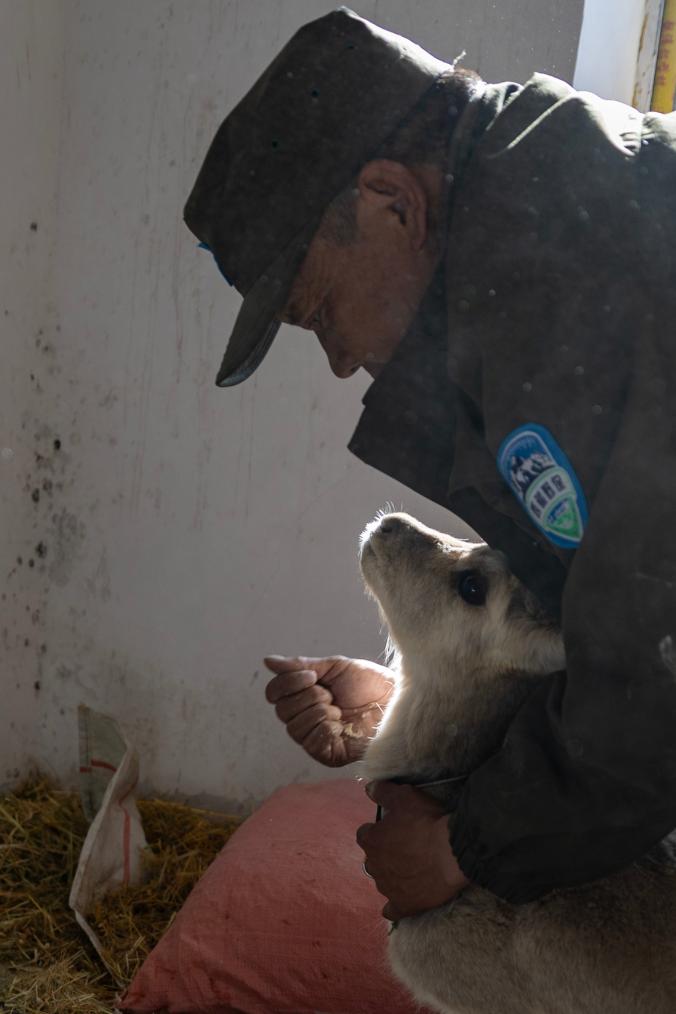 羅布玉杰站的野生動物專業(yè)管護隊員在出發(fā)巡護前給站里救護的受傷藏原羚喂糌粑(5月7日攝)。新華社記者 姜帆 攝