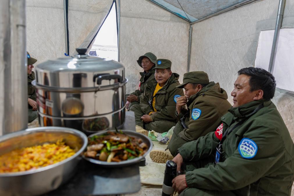 野生動物專業(yè)管護隊員們在巡護途中宿營的帳篷內準備吃飯(5月7日攝)。新華社記者 姜帆 攝