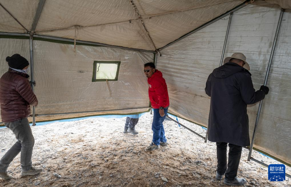 6月13日,格桑倫珠(中)、管護(hù)隊(duì)員和記者一起搭帳篷。新華社記者 費(fèi)茂華 攝