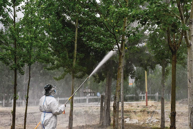 病因找到了,如何對(duì)癥下藥才是關(guān)鍵。防治隊(duì)將整片楊樹林分成三個(gè)區(qū)域,首先伐掉干死腐爛的樹,其次對(duì)病害區(qū)域進(jìn)行殺菌消毒?!懊總€(gè)區(qū)域我們噴灑的藥劑也不同,主要是想對(duì)防治效果進(jìn)行實(shí)驗(yàn)。通過持續(xù)兩個(gè)月的觀察,發(fā)現(xiàn)第一組藥劑防治效果明顯,因此我們開始在整片楊樹林推廣第一組藥劑?!秉S敏說(shuō)。