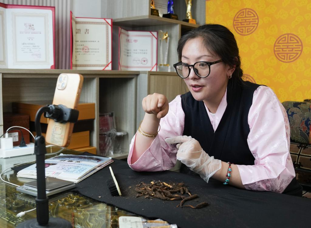 在夢(mèng)譽(yù)蟲草產(chǎn)業(yè)帶直播基地,羅拉的妻子次仁白吉在直播帶貨(5月31日攝)。新華社記者丁汀 攝