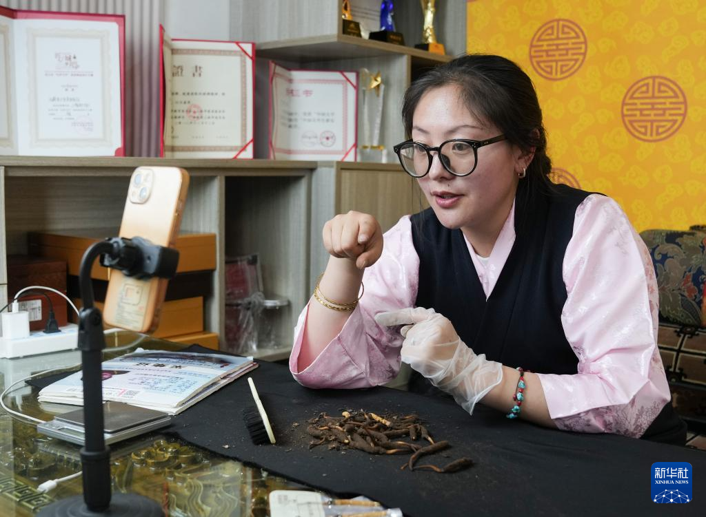 5月31日,在西藏拉薩市,藏族青年羅拉的妻子次仁白吉在直播帶貨。新華社記者 丁汀 攝