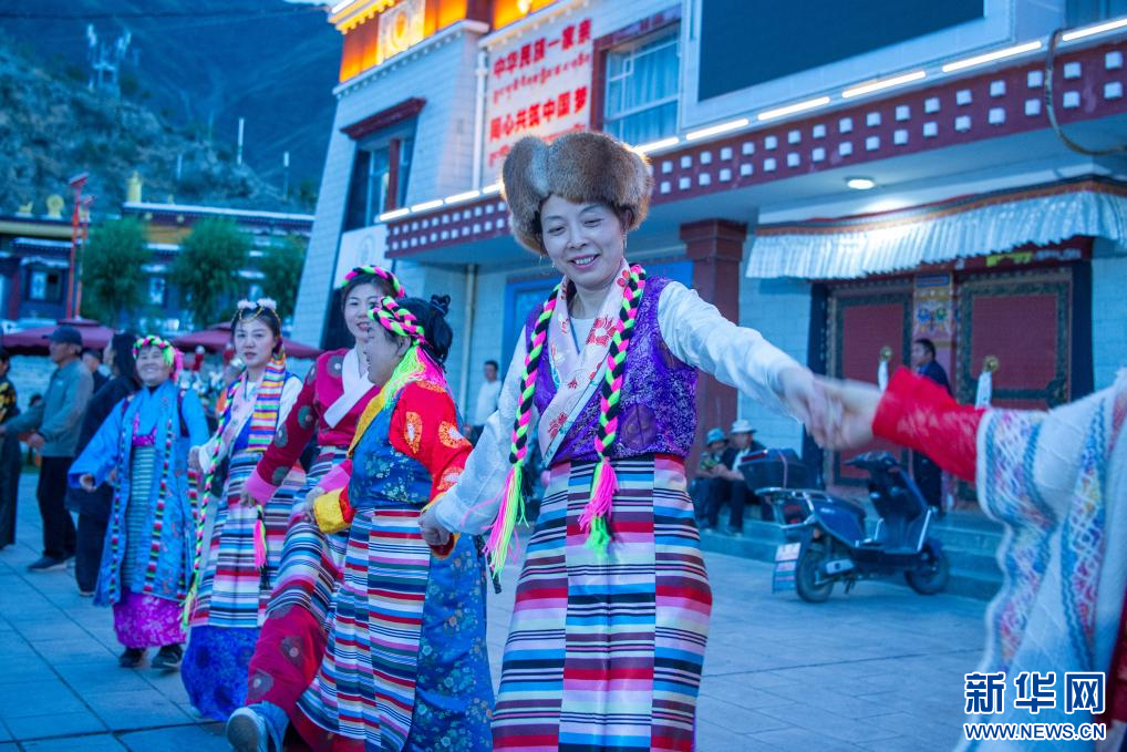 6月24日,游客在扎西曲登社區(qū)廣場體驗(yàn)篝火廣場舞。新華網(wǎng) 旦增努布 攝