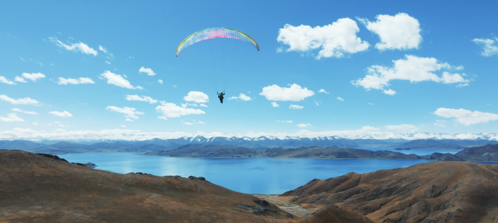 李生濤在羊卓雍錯湖上飛滑翔傘