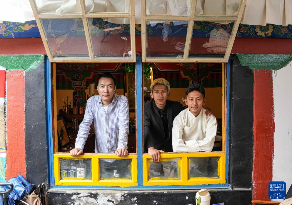 咖啡店三名年輕合伙人旦增特覺(右)、旦增格桑(中)和扎西多吉合影(7月5日攝)。新華社記者 晉美多吉 攝