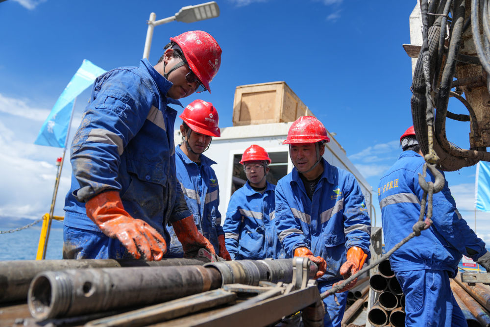 7月11日,鉆探隊(duì)隊(duì)員在準(zhǔn)備增加孔內(nèi)鉆桿。新華社記者 晉美多吉 攝