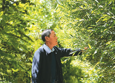 邊久在苗圃基地檢查樹苗生長(zhǎng)情況。