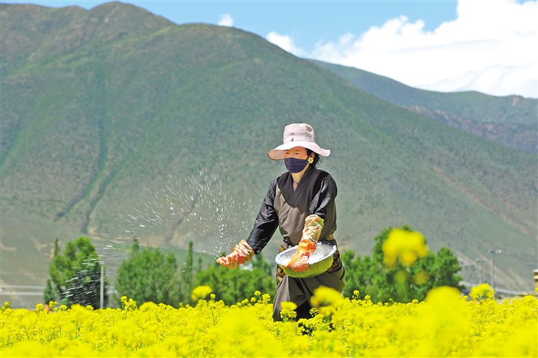 墨竹工卡縣唐加鄉(xiāng)拉東村村民正在油菜花田里施肥。