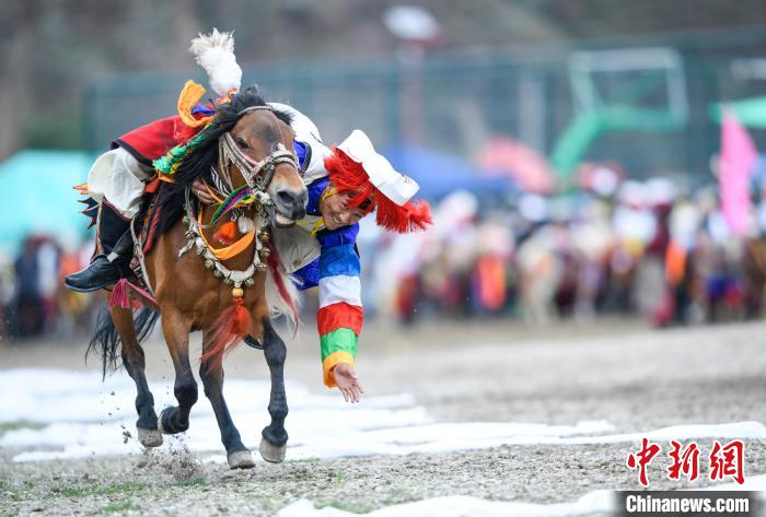 7月21日,西藏自治區(qū)拉薩市堆龍德慶區(qū)馬鎮(zhèn)朗巴村民眾賽馬歡度“望果節(jié)”?!巴?jié)”民俗已有1500多年的歷史,是國家級非物質(zhì)文化遺產(chǎn)。圖為騎手進(jìn)行馬術(shù)表演。中新社記者 貢嘎來松 攝