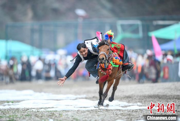 7月21日,西藏自治區(qū)拉薩市堆龍德慶區(qū)馬鎮(zhèn)朗巴村民眾賽馬歡度“望果節(jié)”。“望果節(jié)”民俗已有1500多年的歷史,是國家級非物質(zhì)文化遺產(chǎn)。圖為騎手進(jìn)行馬術(shù)表演。中新社記者 貢嘎來松 攝