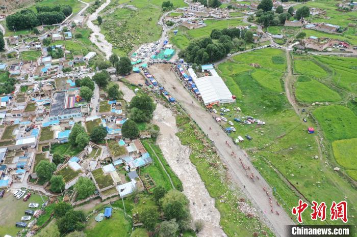 7月21日,西藏自治區(qū)拉薩市堆龍德慶區(qū)馬鎮(zhèn)朗巴村民眾賽馬歡度“望果節(jié)”?!巴?jié)”民俗已有1500多年的歷史,是國家級非物質(zhì)文化遺產(chǎn)。圖為賽馬比賽現(xiàn)場。(無人機(jī)照片)中新社記者 貢嘎來松 攝