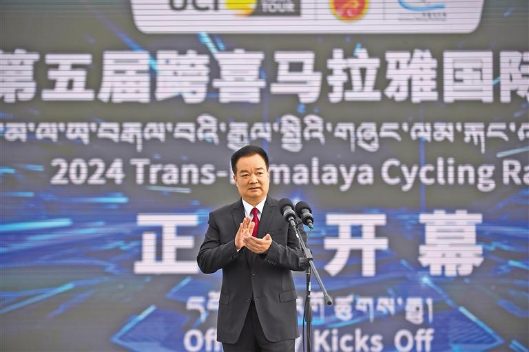 8月21日上午,2024中國(guó)西藏第五屆跨喜馬拉雅國(guó)際公路自行車極限賽在拉薩市布達(dá)拉宮廣場(chǎng)隆重開幕。這是自治區(qū)黨委書記王君正出席開幕式并宣布本屆比賽開幕。 本報(bào)記者 李洲 攝