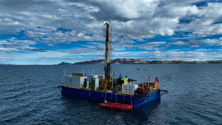 2024年7月11日拍攝的納木錯水上鉆探平臺(無人機(jī)照片)。 新華社記者 晉美多吉 攝