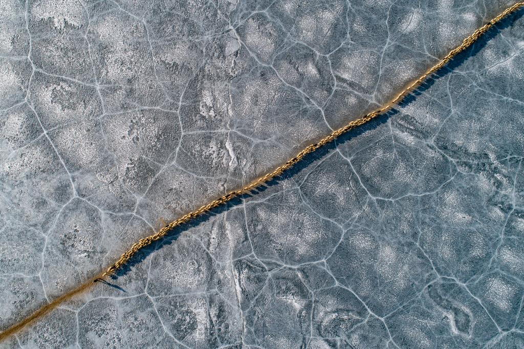 羊群順著安全小路通過普莫雍錯冰湖(2021年3月6日攝,無人機照片)。