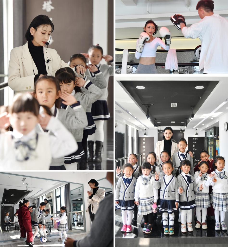 這是一張拼版照片,左上圖為:洛桑卓瑪指導參加少兒模特培訓的學生(2021年3月13日攝);左下圖為:洛桑卓瑪(右一)和參加少兒模特培訓的學生一起做游戲(2021年3月13日攝);右上圖為:洛桑卓瑪(左)在拉薩一家健身房上搏擊課(2021年3月14日攝);右下圖為:洛桑卓瑪和參加少兒模特培訓的學生合影(2021年3月13日攝)。