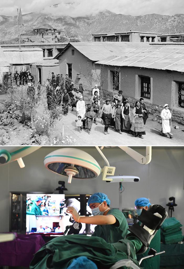 拼版照片:上圖是20世紀50年代,前往拉薩市人民醫(yī)院看病的藏族群眾在護士陪同下到醫(yī)療室去就診(新華社記者任用昭攝);下圖是2021年4月19日,拉薩市人民醫(yī)院骨科醫(yī)生通過5G通信技術,在北京積水潭醫(yī)院專家遠程指導下使用骨科機器人開展手術(新華社記者孫瑞博攝)。