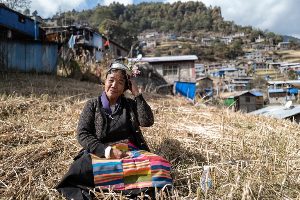 非遺陳塘夏爾巴歌舞代表性傳承人朗嘎在山坡上演唱時調整自己的頭飾(2021年11月27日攝)。