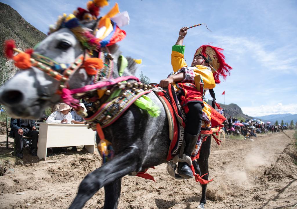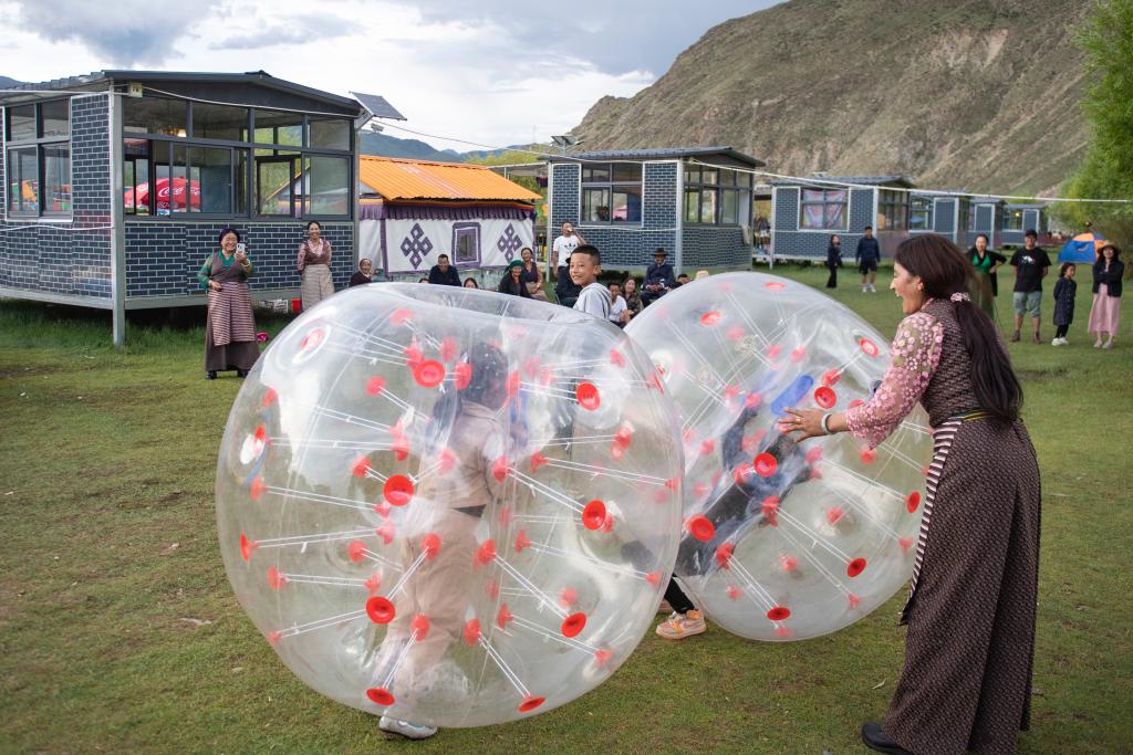 2021年8月11日,人們在拉薩市達孜區(qū)一處林卡營地“過林卡”時玩游戲。