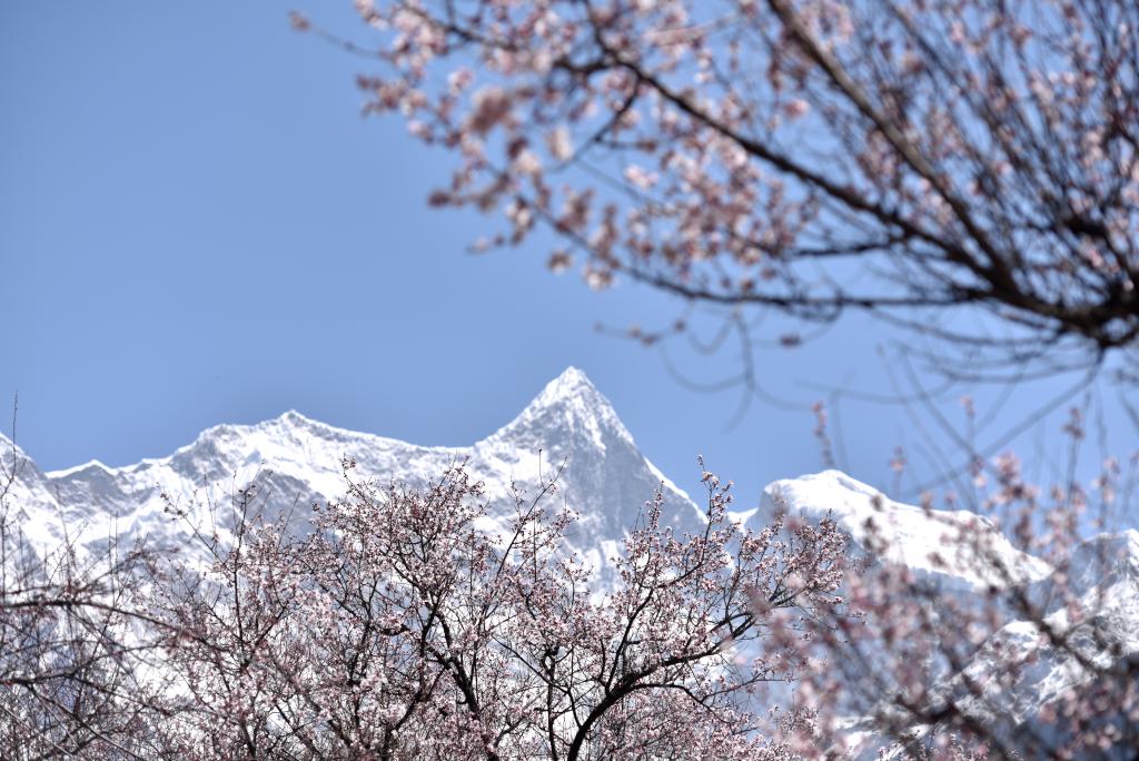這是2021年3月28日在西藏林芝市索松村拍攝的桃花和南迦巴瓦峰。