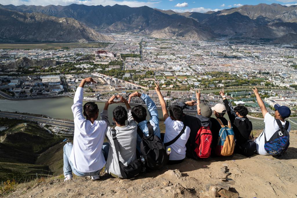 一群大學生在拉薩市南山生態(tài)園的祖國萬歲山山頂合影(2021年9月20日攝)。