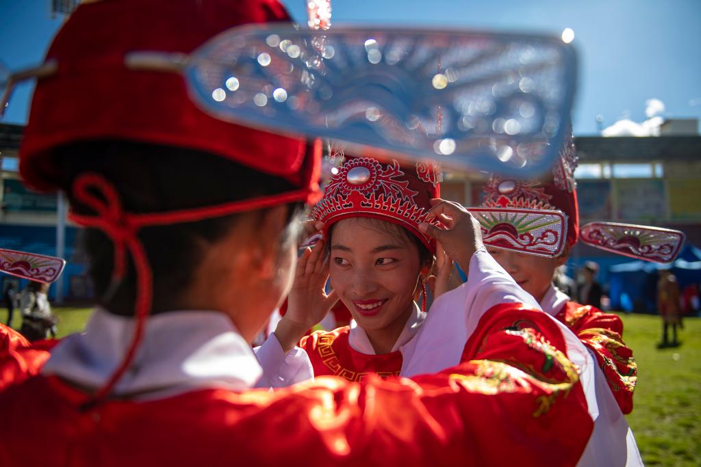2021年9月13日,參加2021雅礱文化旅游節(jié)開幕式文藝演出的山南市第二高級中學學生登臺前整理服裝。