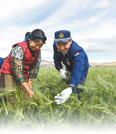 西藏日喀則市崗巴縣援藏干部幫助村民清除青稞田間的雜草。趙啟瑞攝(人民視覺(jué))