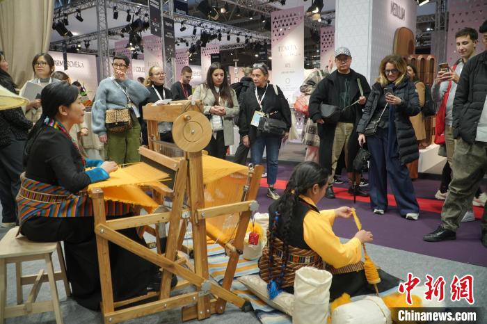 2024年1月,來自中國(guó)西藏的傳統(tǒng)氆氌亮相法國(guó)巴黎時(shí)尚家居設(shè)計(jì)展。(受訪者供圖)
