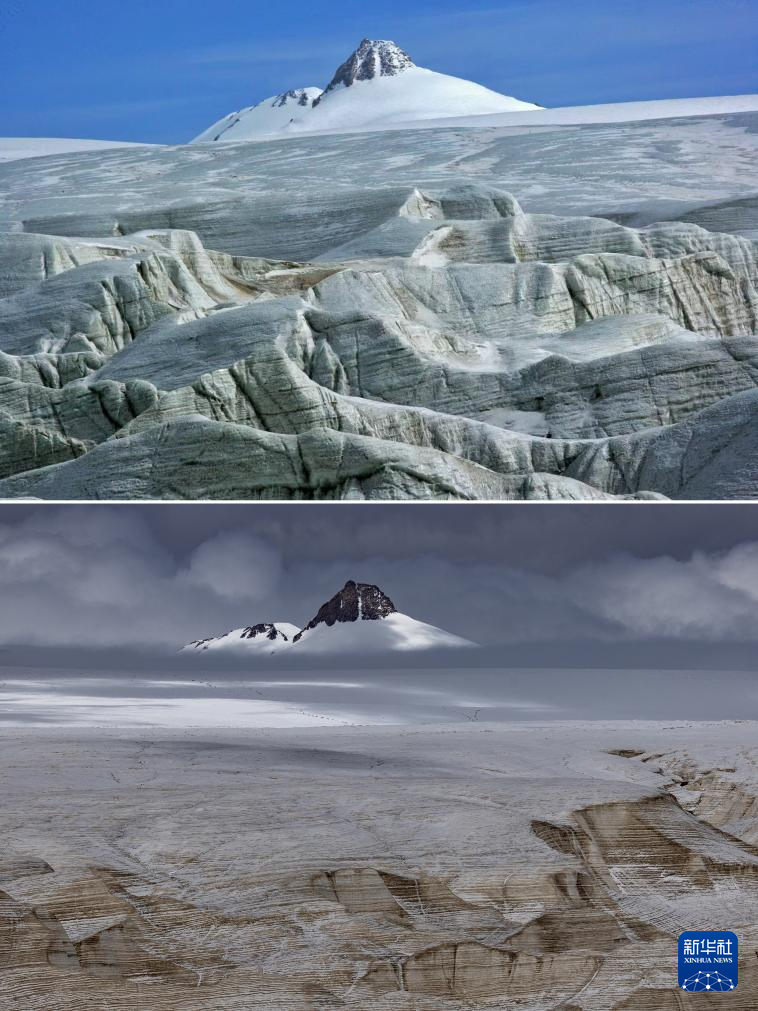 拼版照片:上圖為2009年6月拍攝的普若崗日主峰(新華社發(fā) 車剛攝);下圖為2024年9月4日拍攝的普若崗日主峰(新華社記者姜帆攝)。對比可以看出普若崗日主峰下的冰原消融嚴(yán)重。新華社發(fā)