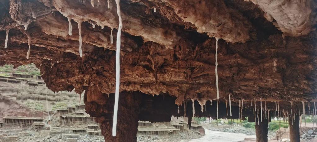 西藏芒康縣納西民族鄉(xiāng)的鹽棚下,梁上垂下鹽柱。新華社記者侯韶婧 攝