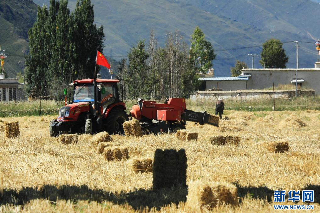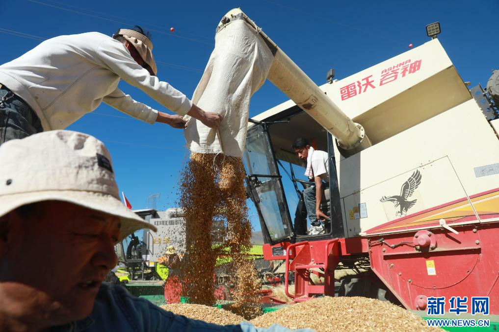 9月19日,墨竹工卡縣村民在進(jìn)行機(jī)械化收割。新華網(wǎng)發(fā) 益果攝