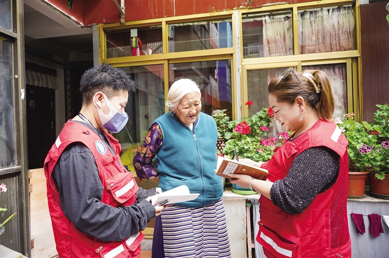 9月12日早晨9點半,丹杰林社區(qū)的網格員們身穿紅馬甲、拿著筆記本,穿梭在轄區(qū)的大街小巷?!鞍屟胱?,我們來啦。”“你們來得剛好,快看看我的手機,這是怎么回事?”“阿媽你看要從這里退出,再打開這個就行了?!痹谖拿鞔笤?,網格員其美玉珍和次仁卓嘎耐心幫73歲的央宗處理遇到的問題——這是他們日常工作的一個縮影。