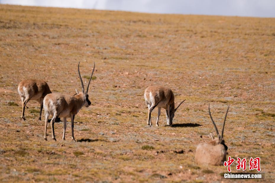 圖為10月3日下午,一群藏羚羊在羌塘草原覓食。中新社記者 江飛波 攝
