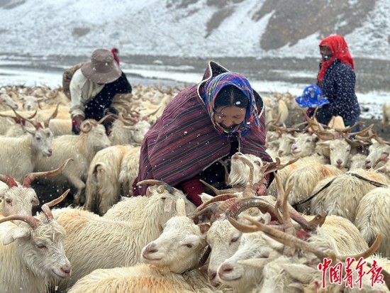 9月13日,西藏阿里地區(qū)日土縣熱幫鄉(xiāng)龍門卡村迎來了一場雪。在海拔近4800米的龍門卡村夏季牧場,牧民們把待擠奶的白絨山羊依次用繩子拴起來。中青報(bào)·中青網(wǎng)記者 石佳/攝
