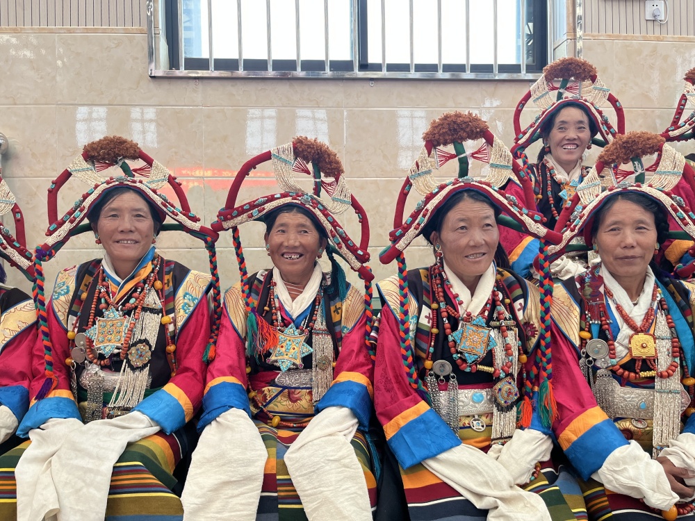 現(xiàn)在的諧欽隊(duì)共有67名成員,30歲以下的年輕人有8人,云丹卓瑪老阿媽也如愿收了一名“關(guān)門(mén)弟子”曲桑。她是諧欽隊(duì)的現(xiàn)任隊(duì)長(zhǎng),從事諧欽已有20多年,后被評(píng)為薩爾諧欽市級(jí)非遺傳承人?!拔覀兞η笤诒A羲_爾諧欽原汁原味的基礎(chǔ)上,在舞步與服飾上有所改進(jìn),更好地展現(xiàn)當(dāng)代農(nóng)牧民的風(fēng)采?!彼f(shuō)。
