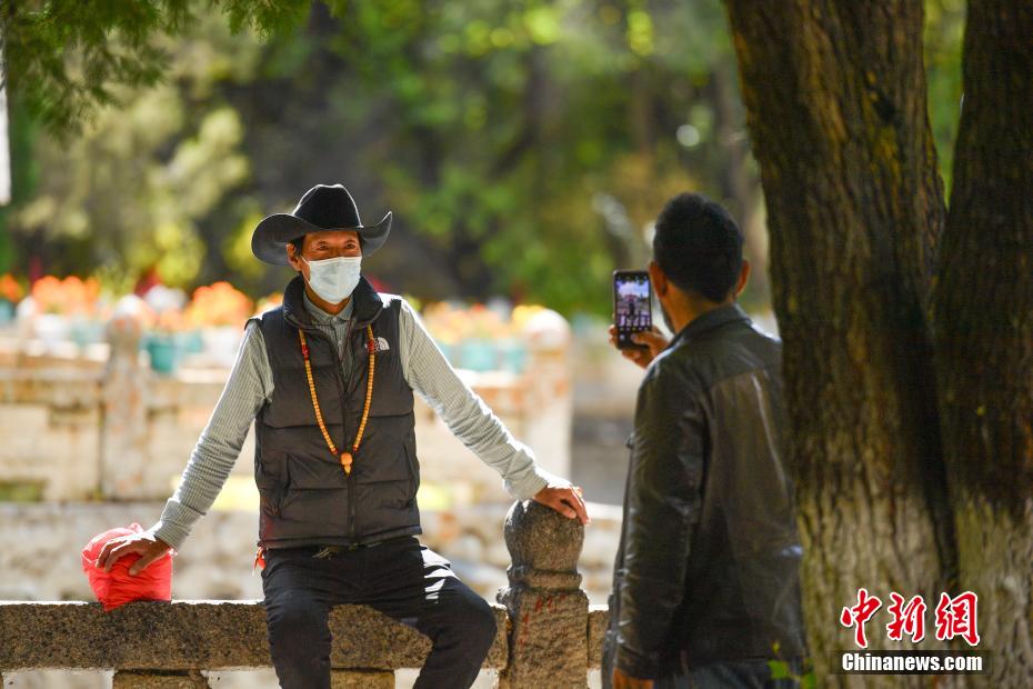 金秋十月,拉薩市西郊羅布林卡秋意正濃,景色宜人。眾多市民、游客紛紛前往打卡。羅布林卡藏語(yǔ)意為“寶貝園林”,始建于公元十八世紀(jì)40年代,是典型的藏式風(fēng)格園林,也是西藏的世界文化遺產(chǎn)之一,有格桑林卡、措吉頗章、金色頗章等宮殿建筑群。這里秋景如畫,成為人們感受自然與歷史文化的好去處。圖為10月21日,民眾在羅布林卡內(nèi)拍照留念。貢確 攝