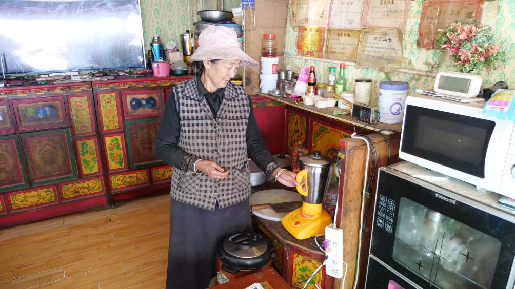 10月21日,瓊國(guó)在家使用電動(dòng)酥油機(jī)。新華社記者魏冠宇 攝