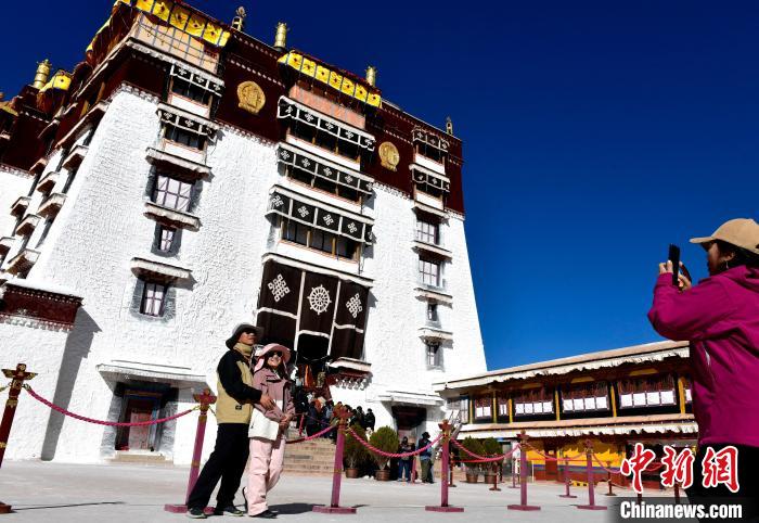 圖為11月1日,游客在布達(dá)拉宮德央夏廣場(chǎng)拍照。中新社記者 李林 攝