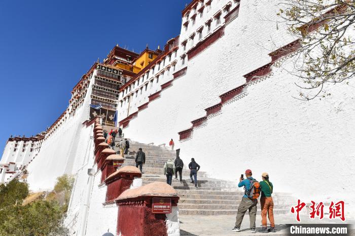 近日,西藏布達拉宮完成粉刷,呈現(xiàn)出別樣的美。粉刷后的宮墻在陽光映照下,與藍天白云相襯,顯得莊嚴肅穆。布達拉宮的粉刷,不僅是為了讓其外觀更加美觀,更重要的是能對墻體建筑起到保護作用,增強其防雨功能。按照慣例,布達拉宮每年藏歷九月左右開始粉刷,并且要在藏歷九月二十二日“降神節(jié)”之前完成,期間有眾多民眾,游客積極參與。布達拉宮作為世界文化遺產(chǎn),是眾多進藏游客必去的“打卡點”。圖為11月8日,游客沿著臺階步行進入布達拉宮。中新社記者 貢確 攝