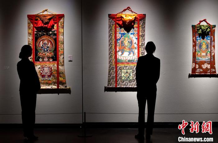圖為觀眾欣賞展覽中的唐卡作品。中新社記者 李林 攝