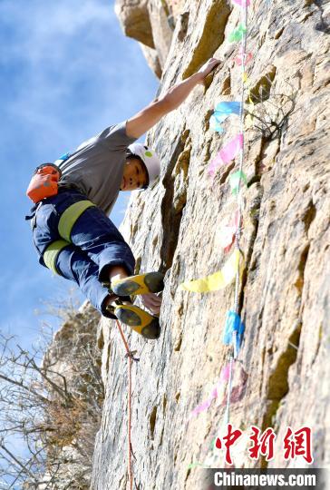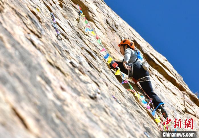 11月17日,2024年西藏自治區(qū)攀巖自然巖壁公開賽決賽在拉薩市城關區(qū)奪底街道吉倉自然巖壁場地舉行。本次賽事共有來自全國的55名選手參賽,分預賽和決賽兩輪。圖為參賽選手劉亞豪決賽中。中新社記者 李林 攝