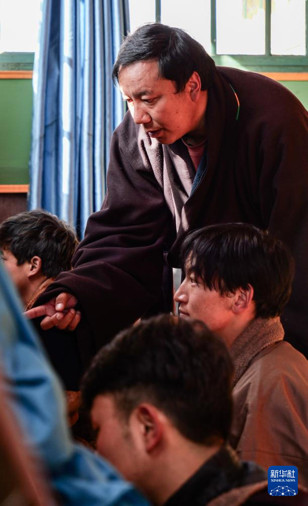 11月22日,昌都市丁青縣擁忠文化藝術(shù)中心非遺扶貧就業(yè)工坊老師在指導(dǎo)學(xué)員寫藏文書法。新華社記者 格桑朗杰 攝
