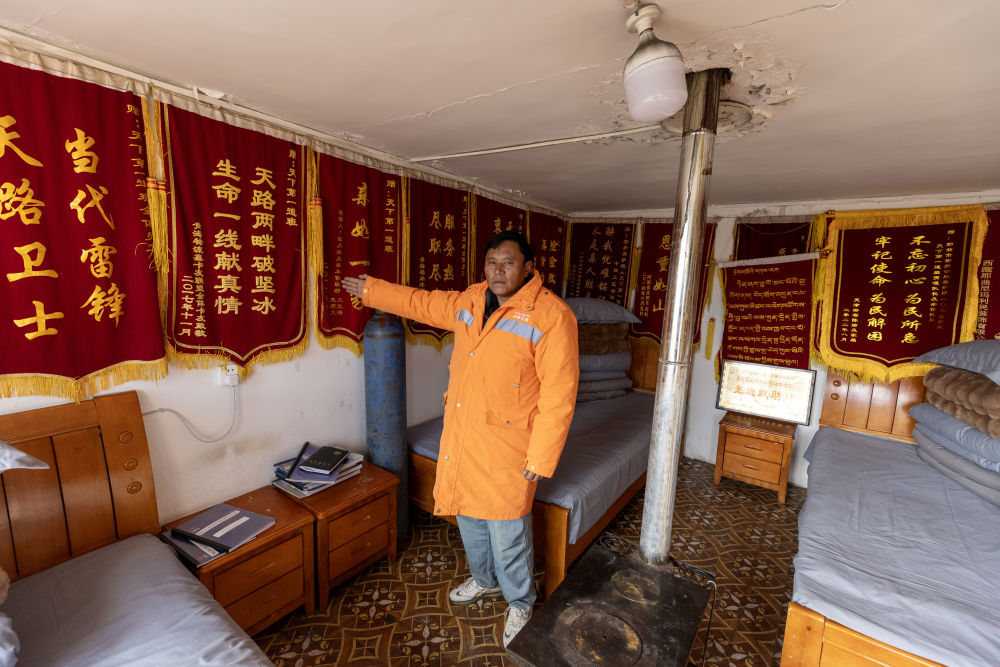 這里的救助站吸引了記者的注意。進入房間,內(nèi)有床鋪、氧氣瓶、抗高反藥等物品,四面墻上掛滿錦旗。一封毛筆書寫的紅底感謝信格外顯眼,信中表達了對地嘎、東力、次仁多吉三名養(yǎng)路工人的感謝。信中寫道:“在那漫長的10個小時里,你們不顧危險和疲憊,想盡辦法讓我脫險?!?/p>
