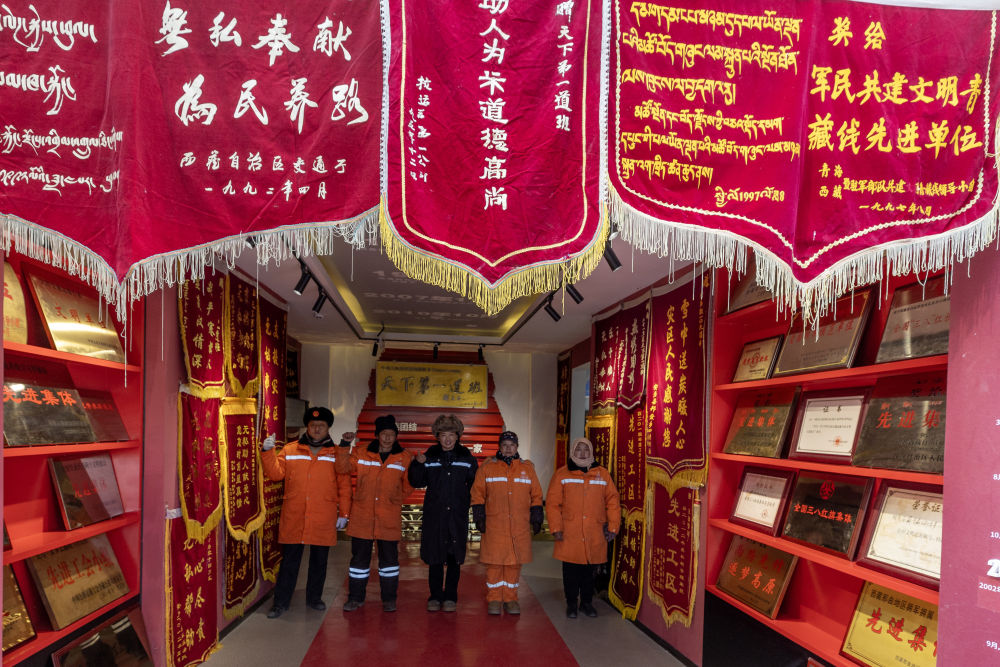養(yǎng)路工人在“天下第一道班”紀念館內(nèi)合影(12月1日攝)。新華社記者 姜帆 攝