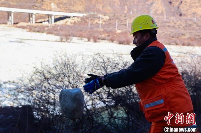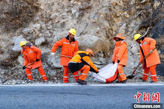 12月16日,西藏自治區(qū)林芝公路事業(yè)發(fā)展和應(yīng)急保障中心(工布江達(dá)養(yǎng)護(hù)段)道路養(yǎng)護(hù)工人及時(shí)清除川藏公路上的落石,保障道路暢通。該養(yǎng)護(hù)段擔(dān)負(fù)著川藏公路沿線工布江達(dá)縣路段的養(yǎng)護(hù)管理、應(yīng)急搶險(xiǎn)等工作,包括路面修補(bǔ)、清理邊溝、維護(hù)交通安全設(shè)施等日常養(yǎng)護(hù)工作。圖為養(yǎng)護(hù)工人在公路上巡護(hù)。中新社記者 薛蒂 攝