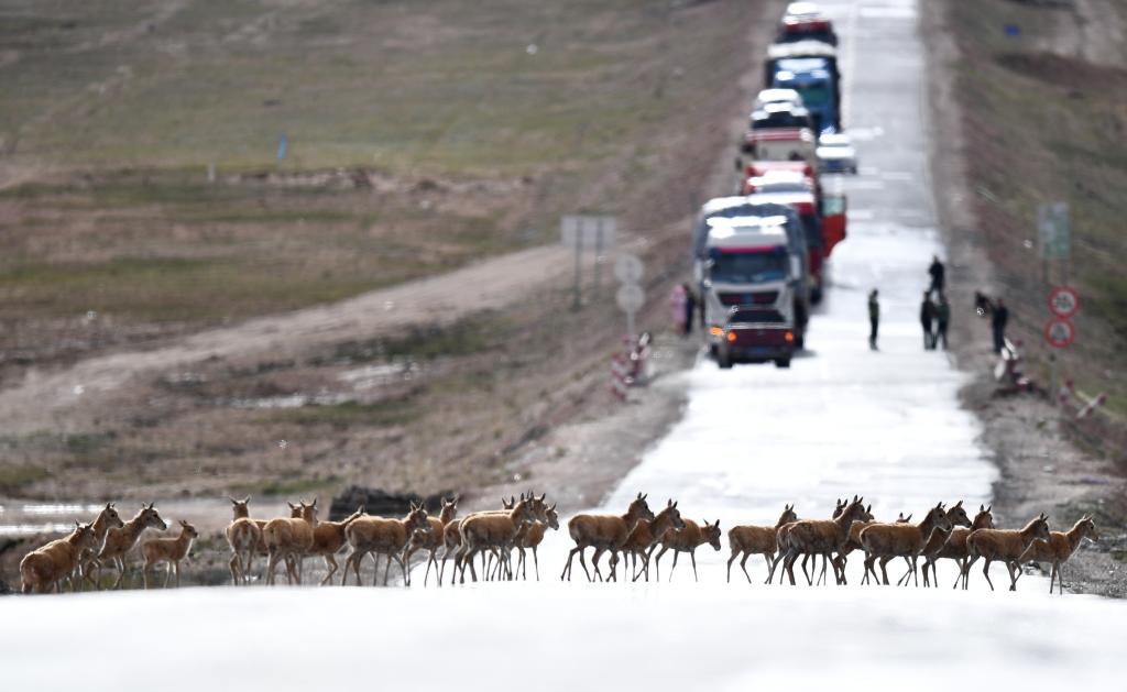 一群藏羚羊通過青藏公路前往青海三江源地區(qū)(2023年7月28日攝)。新華社記者 張宏祥 攝