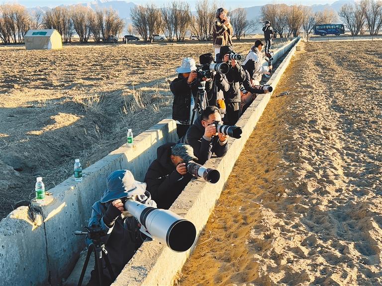 攝影愛好者在拍攝黑頸鶴。