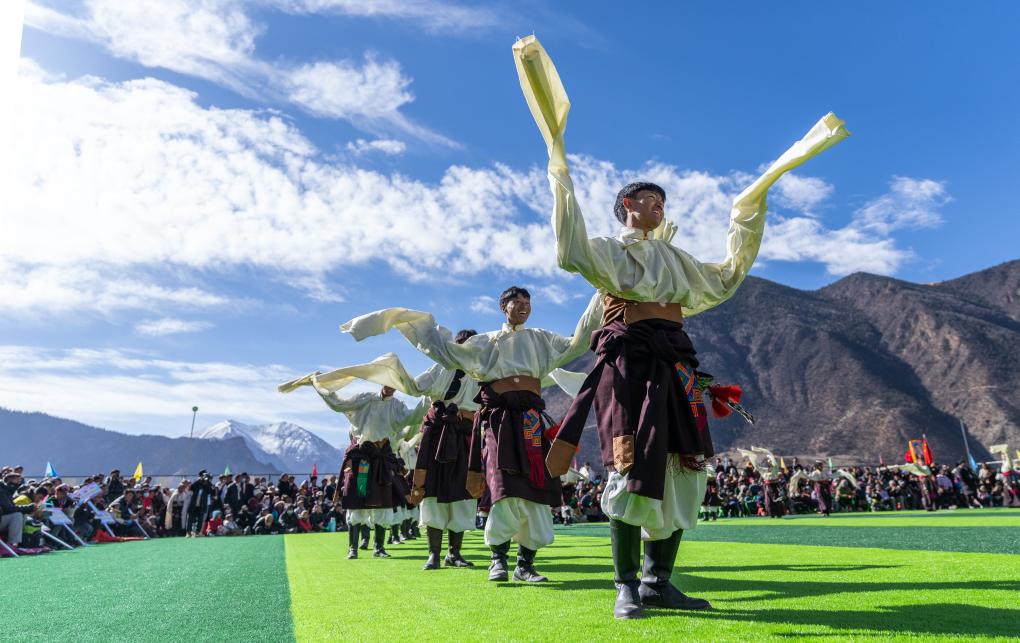 在馬利鎮(zhèn)“云中球場(chǎng)”,當(dāng)?shù)厝罕娫谇蛸愰_幕式上表演舞蹈(1月2日攝)。新華社記者 丁增尼達(dá) 攝